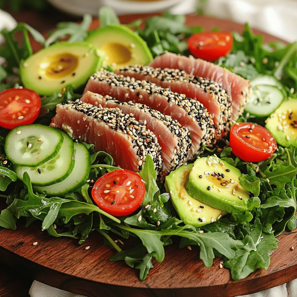 For plating, use a large platter or individual plates. Arrange the salad mix nicely. Slice the seared tuna steaks thinly. Place them on top of the salad. Sprinkle with chopped green onions for a pop of color and taste. This presentation makes the dish inviting.