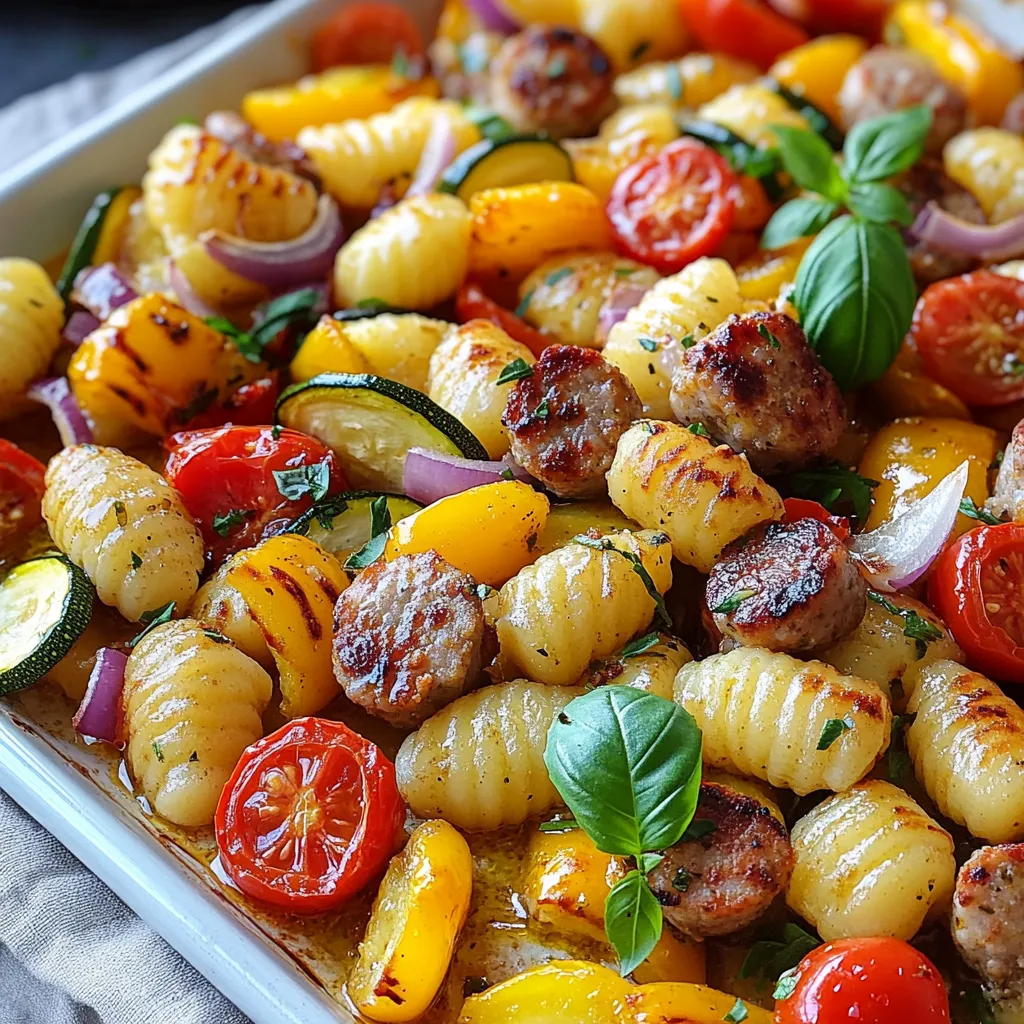 A delicious and easy one-pan meal featuring gnocchi, Italian sausage, and colorful vegetables.