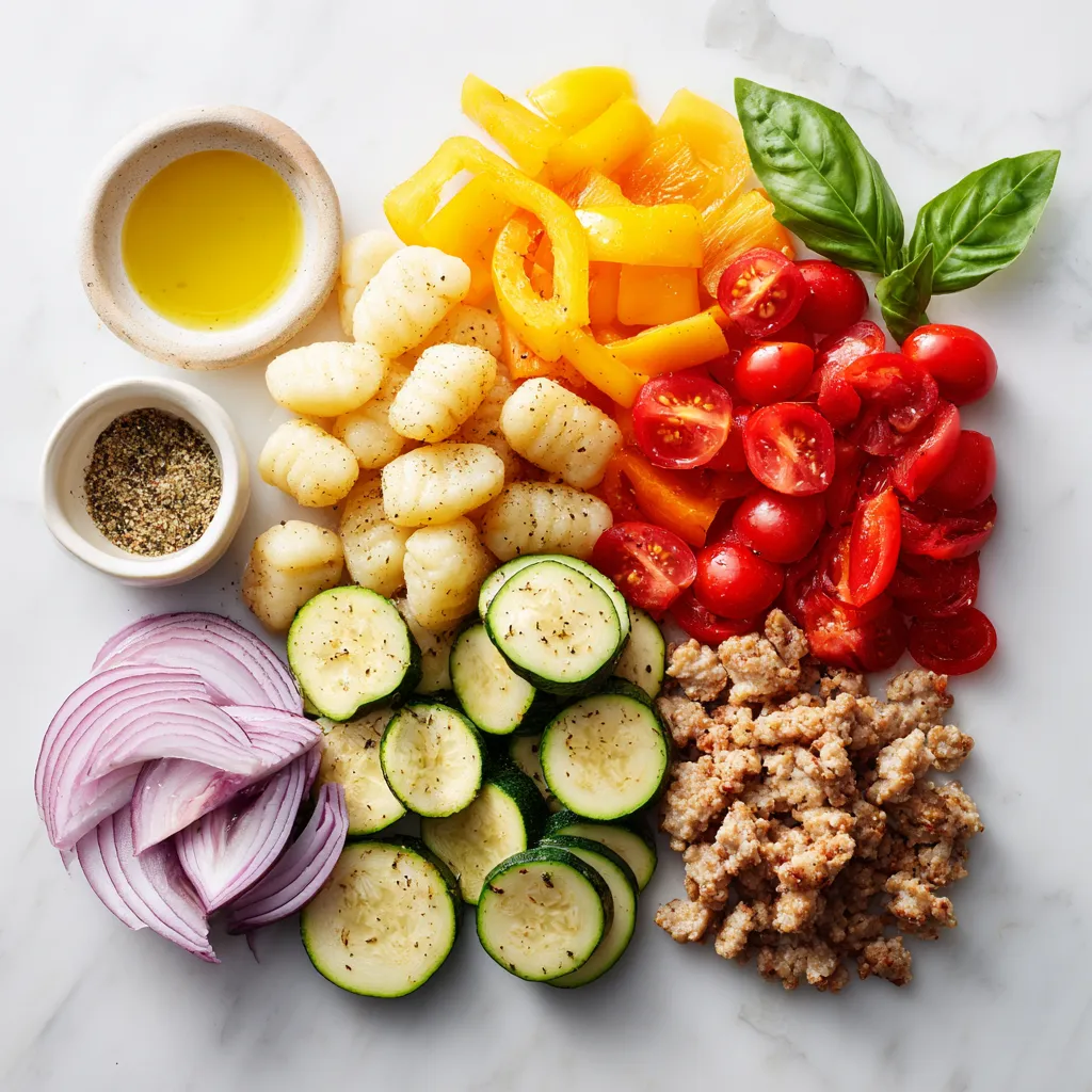 In a large mixing bowl, combine the potato gnocchi, Italian chicken sausage, bell pepper, zucchini, red onion, and cherry tomatoes.