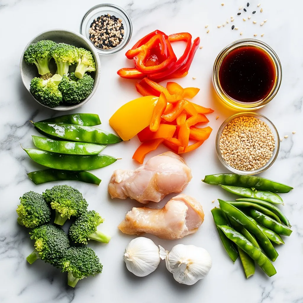 The main ingredients include chicken thighs and fresh vegetables. Chicken thighs give a great flavor. Broccoli, bell peppers, snow peas, and carrots add color and crunch. Each veggie offers a unique taste and texture.