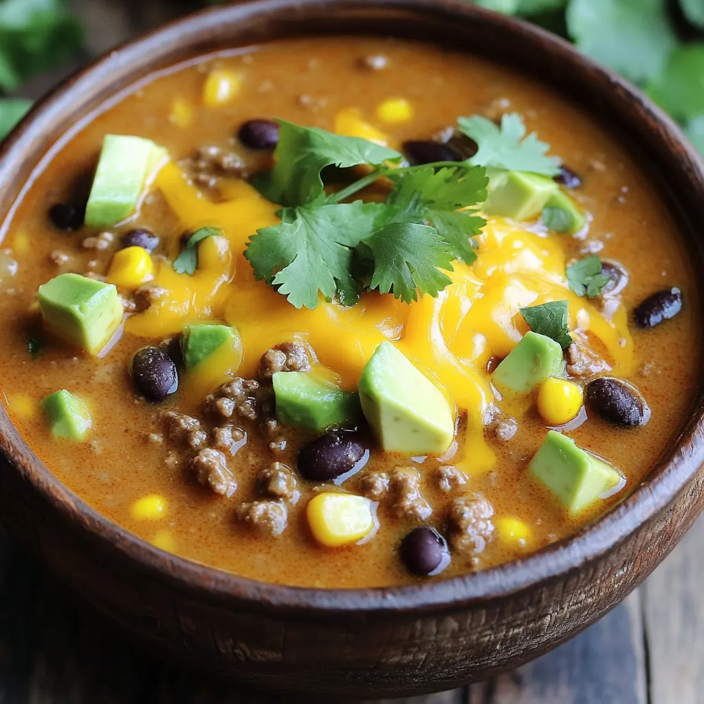 – When ready to serve, ladle the soup into bowls. Top with the remaining shredded cheddar cheese, chopped cilantro, and diced avocado. These fresh toppings add color and extra flavor, making your dish look and taste amazing.