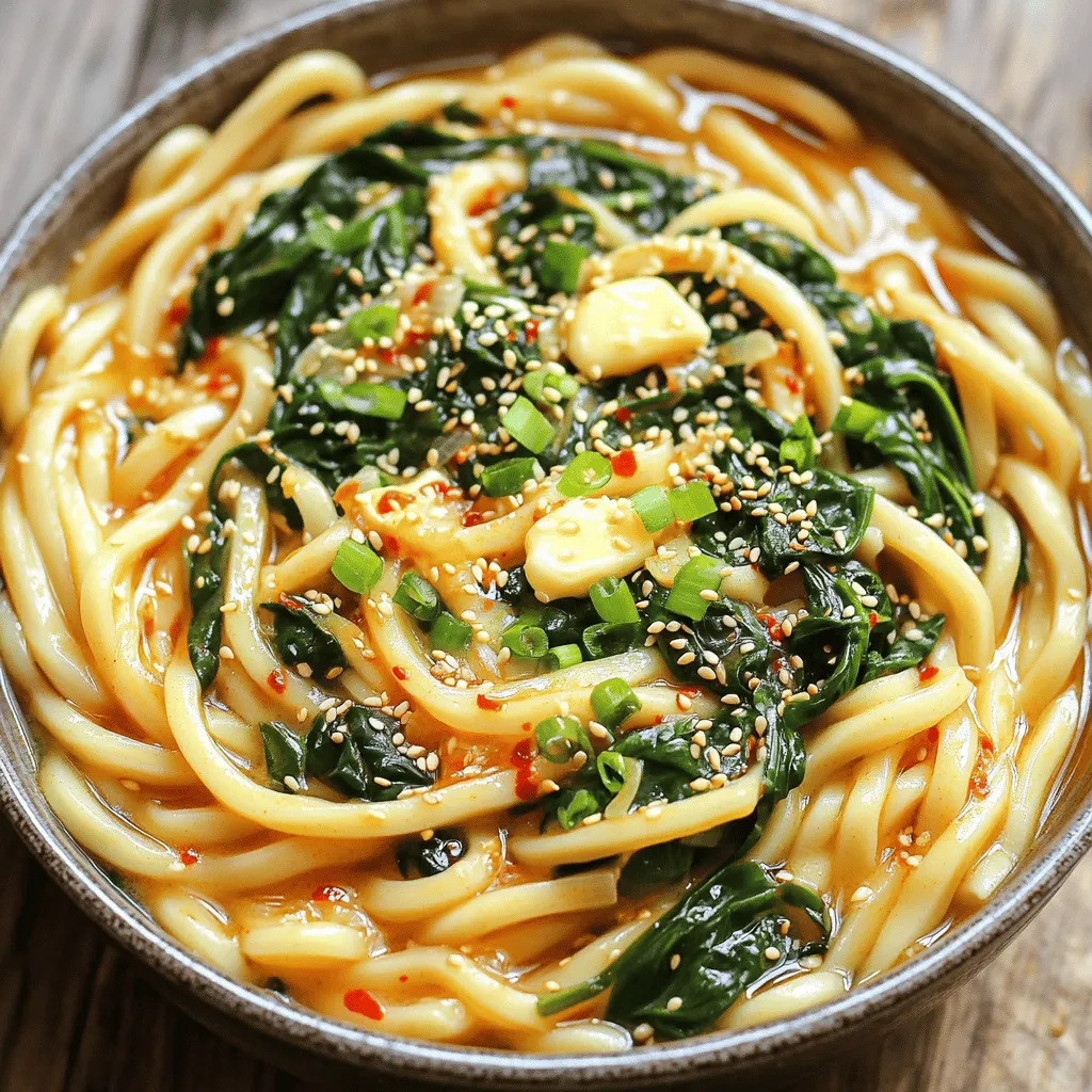 - 400g udon noodles - 4 tablespoons unsalted butter - 6 cloves garlic, minced - 1 teaspoon red pepper flakes (adjust to taste) - 2 tablespoons soy sauce - 1 tablespoon sesame oil - 1 tablespoon chili oil - 2 green onions, finely sliced - 1 cup baby spinach - Salt and pepper to taste - Sesame seeds for garnish Udon noodles are thick and chewy. They soak up flavors well. Unsalted butter gives a rich taste. Minced garlic adds a strong aroma. Red pepper flakes bring heat. Soy sauce adds umami. Sesame oil gives a nutty flavor. Chili oil boosts spice and depth. Green onions add freshness and crunch. Baby spinach adds color and nutrients. Salt and pepper season the dish. For udon noodles, look for fresh or frozen ones. They taste better than dried. I prefer high-quality unsalted butter for a clean flavor. Choose fresh garlic for the best aroma. Use low-sodium soy sauce to control saltiness. For oils, go with pure sesame and chili oil. They enhance flavor greatly. Fresh green onions and baby spinach make a big difference, so buy them from a local market. Start by boiling a big pot of salted water. This helps the noodles cook well. Once it boils, add the udon noodles. Cook them for about 3-5 minutes, as the package says. Stir gently to avoid sticking. After they are soft, drain the noodles and set them aside. In a large skillet, place unsalted butter over medium heat. Watch it melt slowly. Then, add minced garlic and red pepper flakes. Stir this mix for about 1-2 minutes. You want it fragrant but not brown. If the garlic browns, it can taste bitter. Now, it’s time to bring the noodles and sauce together. Add the cooked udon noodles to the skillet. Pour in soy sauce, sesame oil, and chili oil. Toss everything well. You want each noodle to be coated in that tasty garlic butter sauce. This step is key for flavor! Next, add the baby spinach and half of the sliced green onions. Toss again until the spinach wilts. This should take about 1-2 minutes. Taste the noodles. If they need it, sprinkle in salt and pepper. Finally, plate the delicious noodles. Garnish with the rest of the green onions and sesame seeds. This adds a nice crunch and looks great! To cook udon noodles well, follow these tips: - Use a large pot with plenty of water. This helps the noodles cook evenly. - Add salt to the boiling water. It enhances the noodle's flavor. - Cook the noodles for the time listed on the package. Most take 3-5 minutes. - Stir gently while cooking. This prevents them from sticking together. - Drain and rinse the noodles quickly. This stops the cooking process. Adjusting the spice in your dish is easy: - Start with a small amount of red pepper flakes. You can always add more later. - If you want less heat, reduce the chili oil. A little goes a long way. - Taste the dish as you cook. This helps you find the right balance for you. - Adding more butter or spinach can tone down the heat. They help mellow the spice. You can boost the flavor of your udon noodles with these ideas: - Add vegetables like bell peppers or carrots for crunch and color. - Toss in cooked proteins like chicken, shrimp, or tofu for a hearty meal. - Squeeze fresh lime juice on top for a bright, zesty finish. - Experiment with herbs like cilantro or basil for fresh flavor. - A sprinkle of crushed peanuts adds a lovely texture and taste. {{image_2}} You can easily make this dish vegetarian or vegan. For a vegetarian option, just skip the chili oil that has meat-based ingredients. Use a plant-based butter for the vegan version. You can also add tofu for protein. This adds a nice texture and keeps it hearty. If you want more protein, add chicken, tofu, or shrimp. For chicken, use cooked, shredded pieces. Tofu works best when it’s firm. Pan-fry it until golden. Shrimp should be added right before the noodles. Cook until they turn pink and opaque. These proteins add flavor and make the meal filling. Feel free to mix up the sauces. You can use teriyaki sauce for a sweet taste. Sriracha is another great option if you want more heat. You can also try adding miso paste for a umami kick. Each of these options will change the flavor while keeping it delicious. To keep your spicy garlic butter udon noodles fresh, place them in an airtight container. Make sure to cool the noodles to room temperature first. Store them in the fridge for up to three days. This way, they stay tasty and safe to eat later. When you want to enjoy leftovers, reheat them gently. Use a skillet over medium heat. Add a splash of water or extra chili oil to help them warm up. Stir often to prevent sticking. This keeps the noodles flavorful and moist. You can also use a microwave, but cover the noodles to avoid drying them out. If you want to freeze your udon noodles, they can last up to three months. First, let the noodles cool completely. Then, place them in a freezer-safe bag. Remove as much air as possible before sealing. When you're ready to eat, thaw in the fridge overnight. Reheat them in a skillet with a bit of oil for the best taste. Yes, you can use other noodles. Soba or rice noodles work well. Just adjust cooking times. Udon noodles give a chewy bite, which I love. But feel free to explore! To lower the spice, cut back on red pepper flakes. You can leave them out entirely. Adding more butter or spinach can also help cool the heat. A splash of coconut milk adds creaminess without spice. If you don't have sesame oil, use olive oil or avocado oil. These oils add a nice flavor but won't be identical. You can also try nut oils, like walnut oil, for a different twist. Leftovers can last for about three to four days in the fridge. Store them in an airtight container. Reheat in a pan or microwave. Add a bit of water or broth to keep them moist while heating. We've explored the key ingredients, step-by-step cooking, and useful tips for your udon dish. You learned about ingredient quality, attention to detail in cooking, and ways to customize flavors. Remember, you can adjust spice le