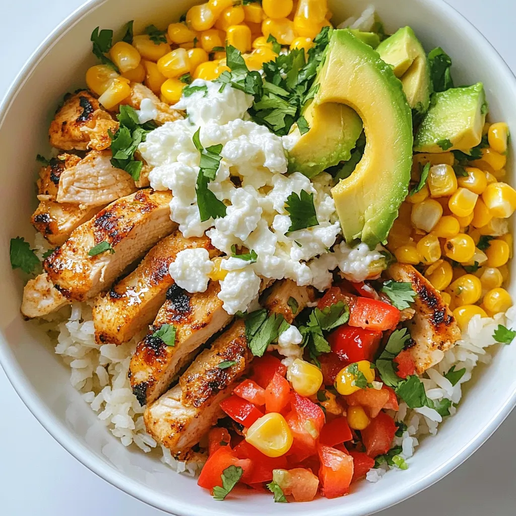 For a great visual appeal, layer the ingredients in your bowl. Start with the rice at the bottom. Then add the chicken, sautéed corn, and colorful veggies on top. Use vibrant bowls to make the dish pop. Consider garnishing with fresh cilantro and lime wedges. This adds a splash of color and extra zest.