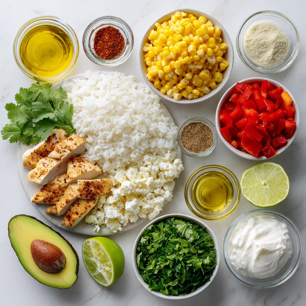 To make this dish, gather all the ingredients first. The jasmine rice gives a nice base. The chicken breast is the star. You can use fresh or canned corn. The red bell pepper adds crunch and color. Sliced avocado brings creaminess. Feta cheese gives a salty kick. Fresh cilantro adds flavor. Olive oil is key for cooking.