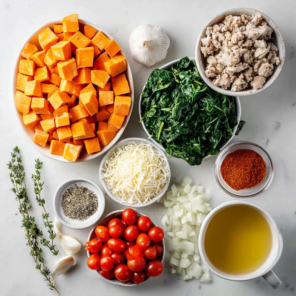 For this Turkey Sweet Potato Bake, I love using simple, fresh ingredients. Ground turkey brings protein and flavor. Sweet potatoes add sweetness and creaminess. Spinach gives us bright color and nutrients.