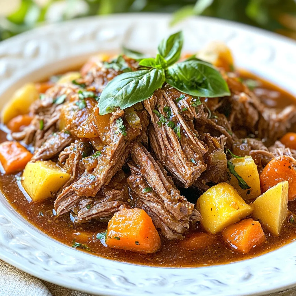 • Serve the shredded beef on a platter, garnished with fresh basil for a colorful touch.